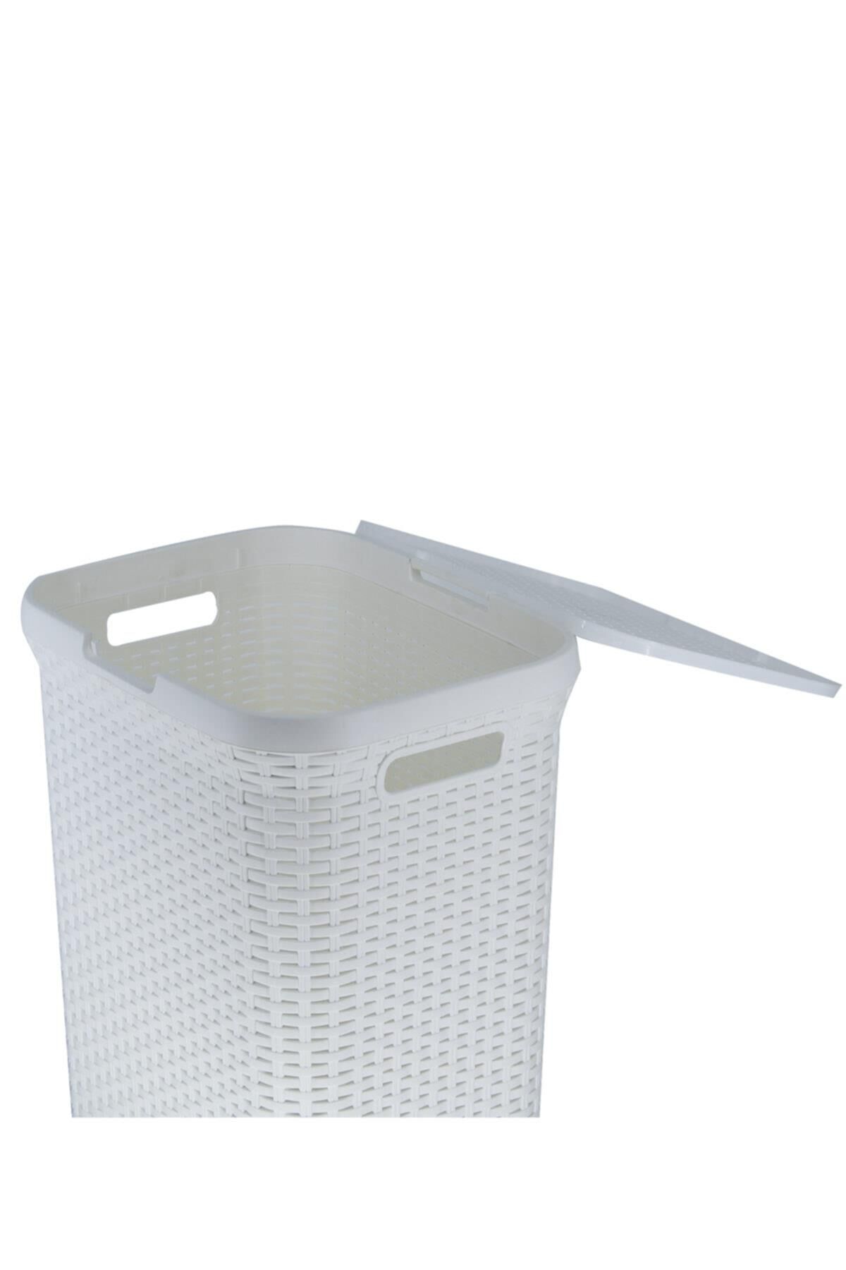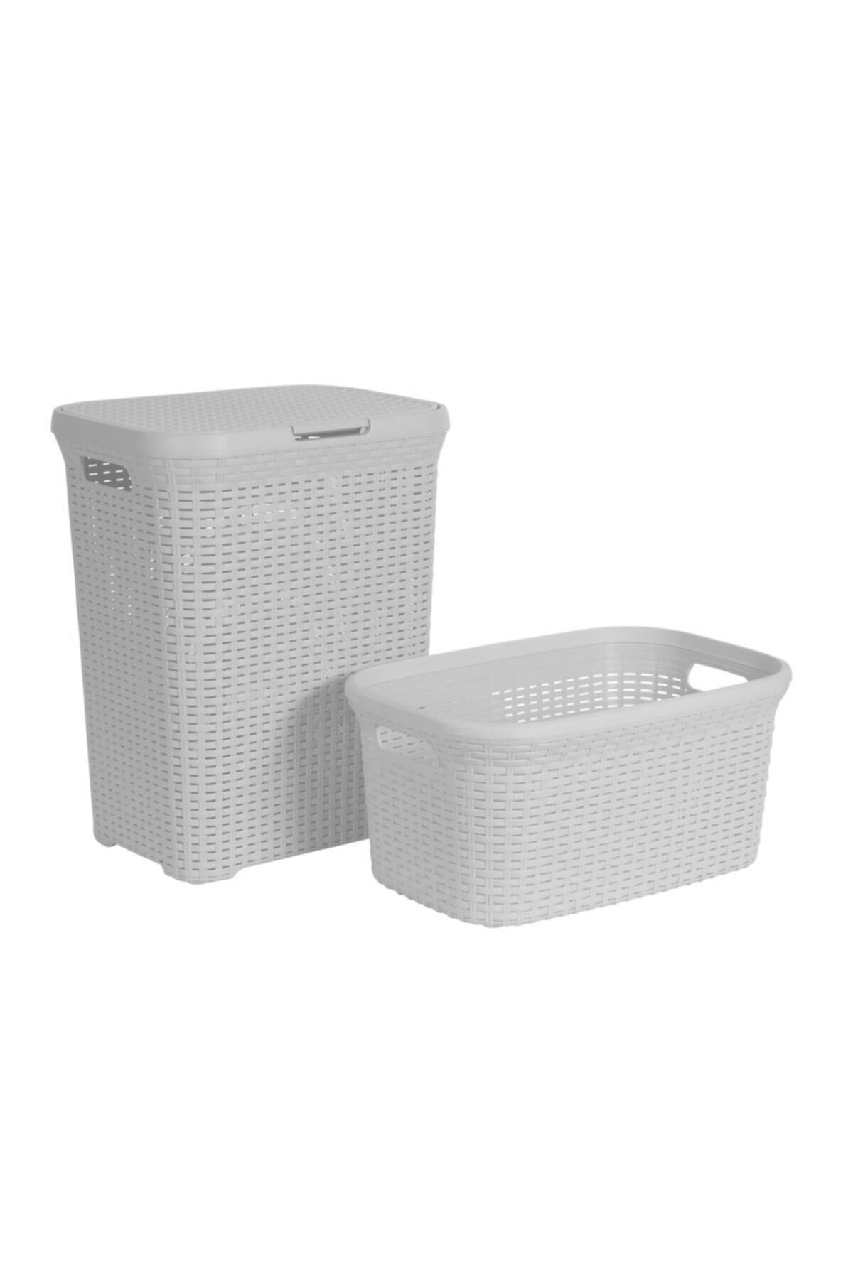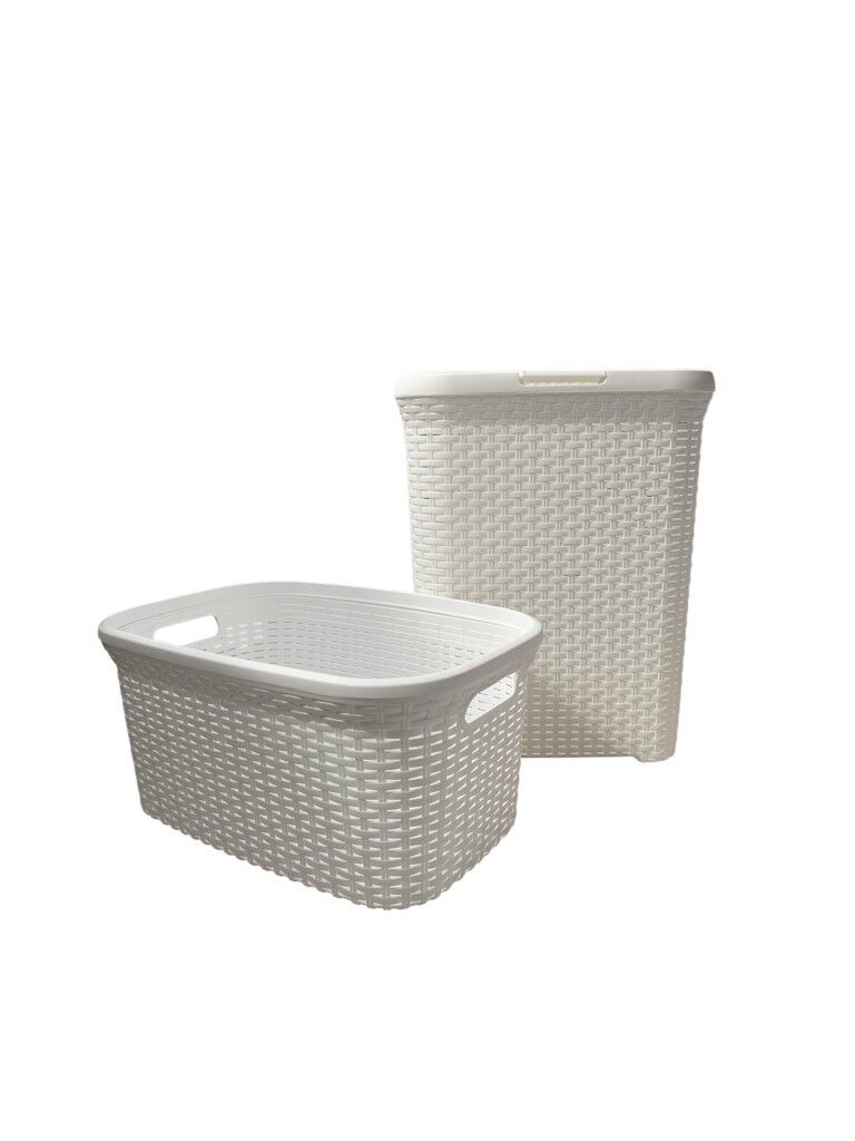 2'li Set Hasır Desenli Plastik Beyaz Çamaşır Sepeti & Beyaz Çamaşır Selesi