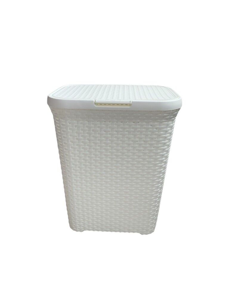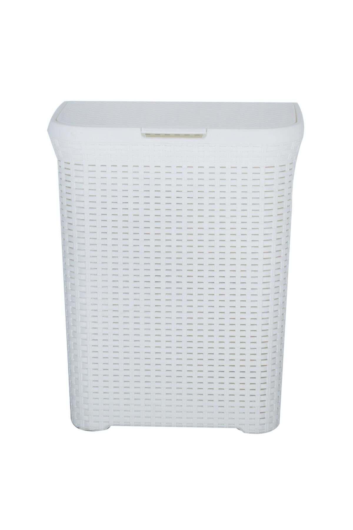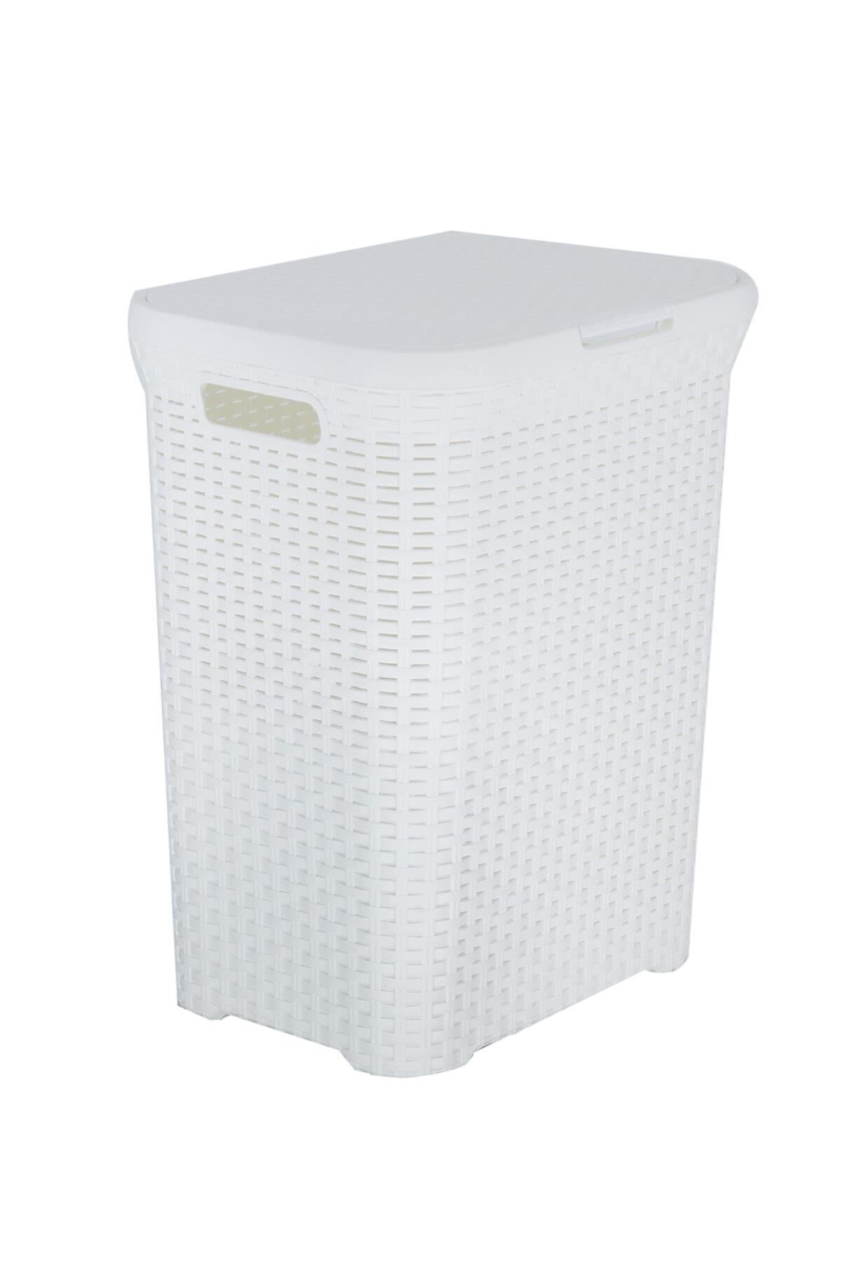 2'li Set Hasır Desenli Plastik Beyaz Çamaşır Sepeti & Beyaz Çamaşır Selesi