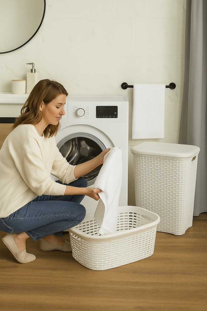 Hasır görünümlü tasarıma sahip olup 50 litre çamaşır kapasitesine sahiptir.