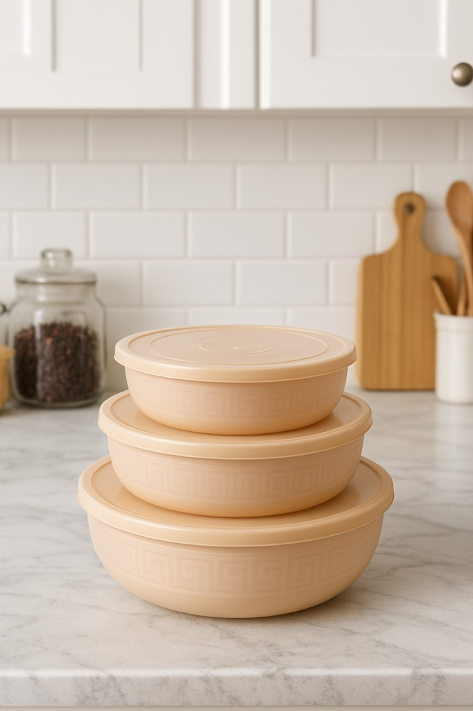 Mutfakta düzen ve tazelik için ideal Somon Rengi 3’lü Yuvarlak Plastik Saklama Kabı Seti, farklı boyut seçenekleriyle gıdalarınızı güvenle saklamanızı sağlar. 5 L, 2.7 L ve 1.5 L kapasiteleri sayesinde hem büyük porsiyonlar hem de küçük atıştırmalıklar için uygundur. Sızdırmaz kapak sistemi ile yiyeceklerin tazeliğini korur, üst üste yerleştirilerek dolap içinde yer tasarrufu sağlar. Bulaşık makinesinde kolayca temizlenebilir, hafif yapısıyla taşıması pratiktir. Evde, ofiste veya piknikte güvenle kullanabilirsiniz.