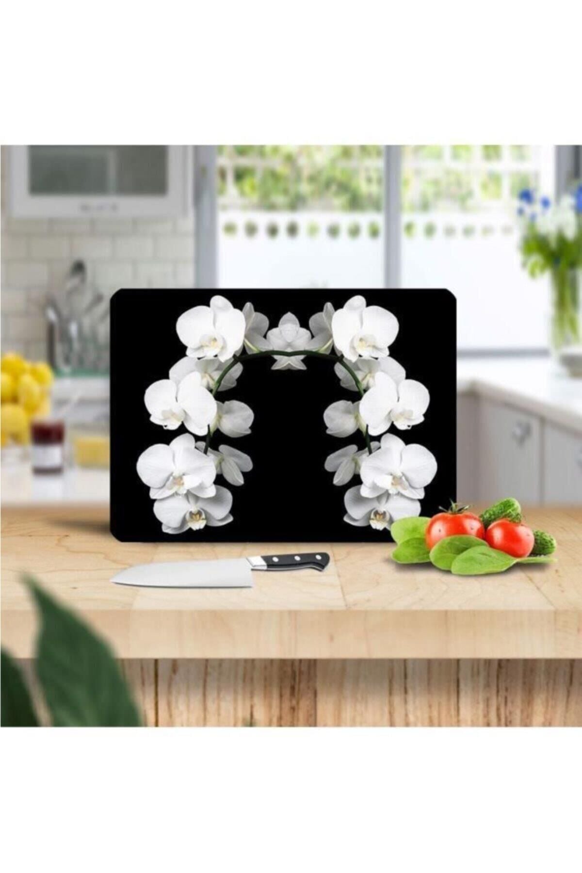 30x40 cm Cam Kesme Tahtası Beyaz Orkide