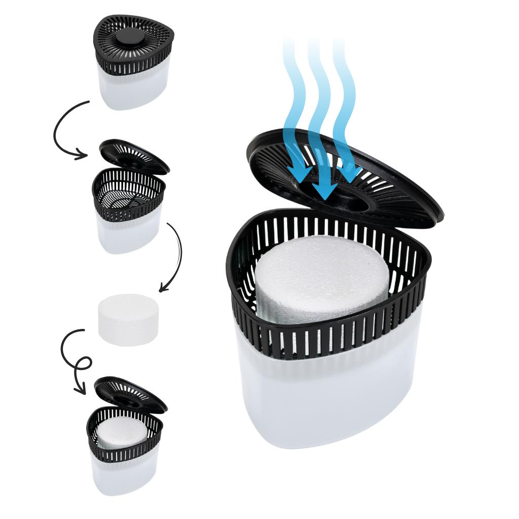 Kompakt ve kullanımı kolay aparatı ile evinizde, ofisinizde, banyonuzda, gardırobunuzda veya depo alanlarınızda rahatlıkla kullanabilirsiniz. Ürün yedek tabletli olarak gelir.