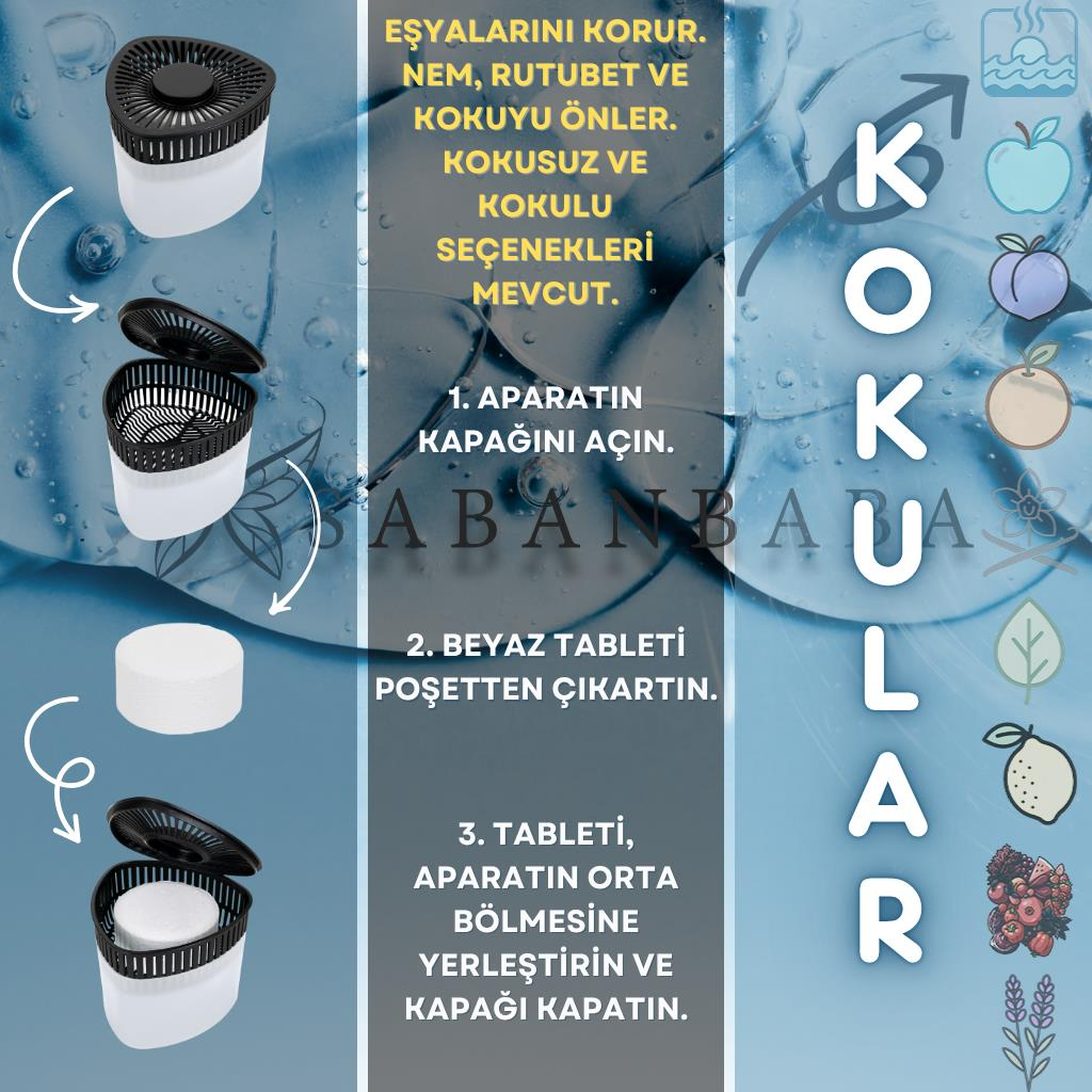 Saban Nem Alıcı & Rutubet Giderici Aparat ve Tablet Seti, yaşam alanlarınızda oluşabilecek nem ve rutubet problemlerine karşı etkili bir çözümdür. Özel olarak geliştirilmiş tablet yapısı sayesinde ortamın nem oranını dengeler, kötü kokuları önler ve küf oluşumunu engeller.