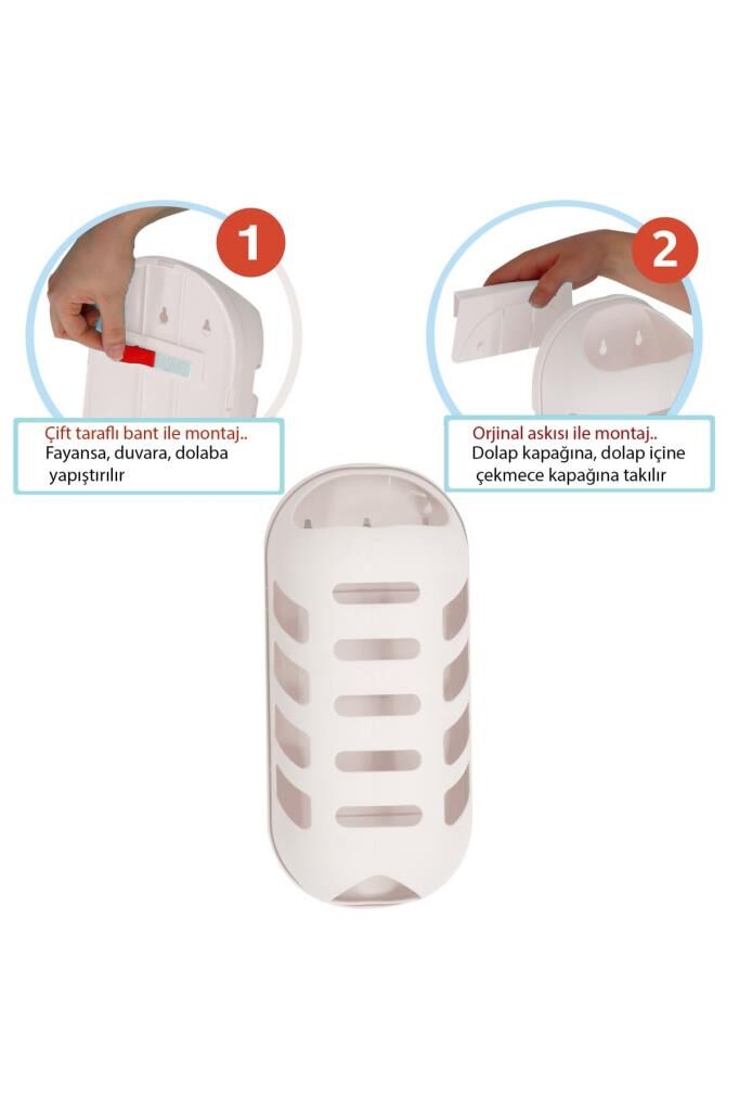 Askı parçası ile dolap veya çekmeceye asılabilir. İstenildiğinde montaj bandı veya vida ile duvara monte edilebilir.