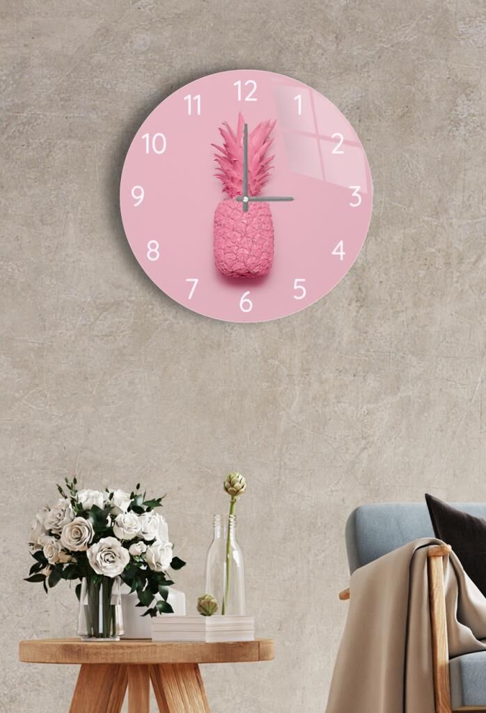 Çap 27cm - Pembe Ananas - Dekoratif Cam Duvar Saati