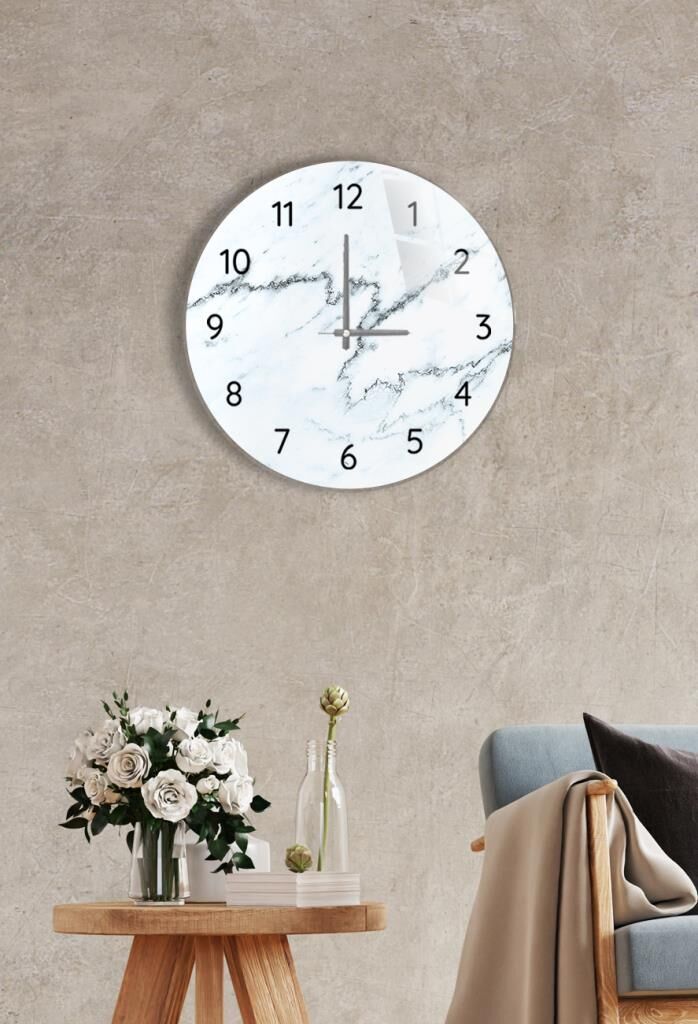 Çap 27cm - Siyah Beyaz Mermer - Dekoratif Cam Duvar Saati