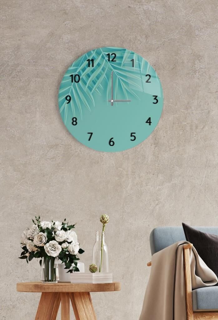 Çap37cm - Mavi Yaz Yaprakları - Dekoratif Cam Duvar Saati