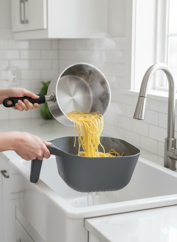 Gri, Kare Makarna Süzgeci – Şık, Pratik ve Dayanıklı Tasarım