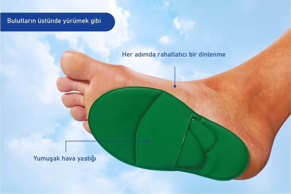 Ayaklarınızı en doğru pozisyonda konumlandırarak tüm vücut konforunuzu artırın! Hava yastıklı özel tasarım, ayak tabanının ön kısmını destekler, ayak tarak kemikleri, omurga ve eklemler üzerindeki baskıyı azaltır. Bu sayede eklem ağrıları hafifler, yürüyüşünüz kolaylaşır ve adımlarınız çok daha keyifli hale gelir.