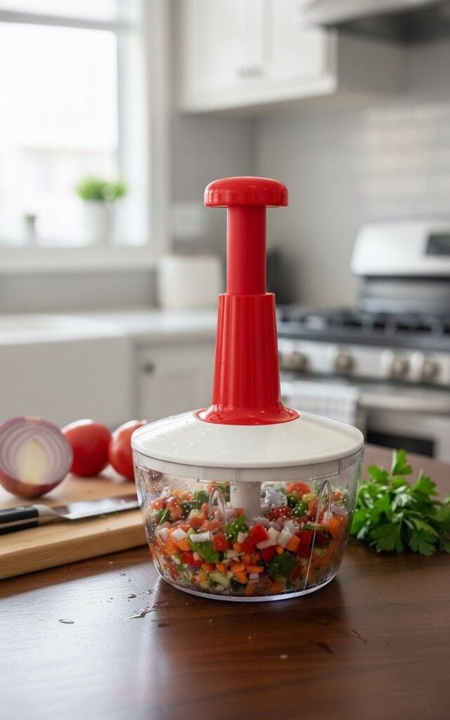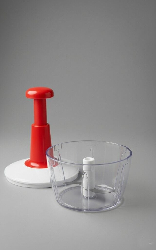 Mutfakta pratikliği ve hızı sevenler için ideal bir yardımcı! Bu manuel el rondosu, güçlü çift paslanmaz çelik bıçağı sayesinde sebze, meyve, kuruyemiş ve diğer yiyecekleri zahmetsizce doğramanızı sağlar. Tek yapmanız gereken üst kısmına bastırmak! Kompakt tasarımı sayesinde yer kaplamaz ve kolayca temizlenir.