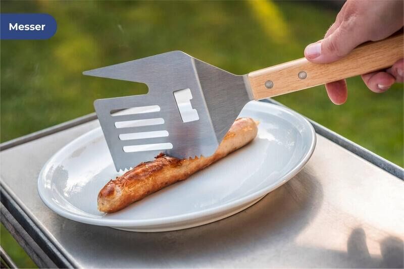 Ölçüler: yaklaşık 39,3 x 10 cm (sap uzunluğu: yaklaşık 23,8 cm), 183 g. Elle yıkanması tavsiye edilir. Pratik bir askı halkası ile birlikte gelir. BBQ Izgara Aleti, mutfakta da mükemmel şekilde kullanılabilir ve her mangal tutkununa hediye edilebilecek ideal bir üründür.