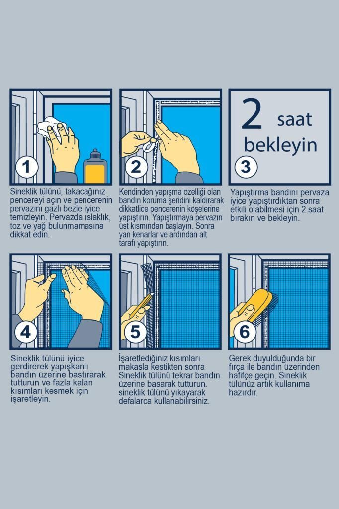- -Çift taraflı bant tülün pencerelere ve kapılara güçlü bir şekilde tutunmasını sağlar