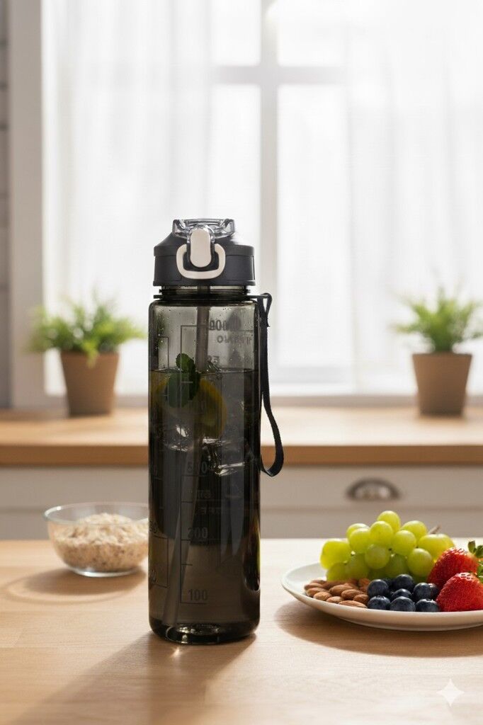 Siyah Şeffaf Pipetli Matara – 900 ml, Sızdırmaz Kapaklı Suluk